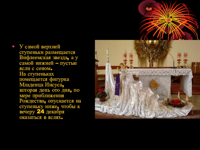 На ступеньках помещается фигурка Младенца Иисуса, которая день ото дня, по мере приближения Рождества, опускается на ступеньку ниже, чтобы к вечеру 24 декабря оказаться в яслях.