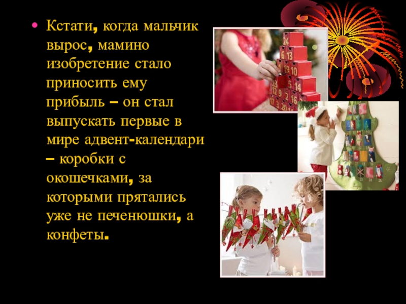 он стал выпускать первые в мире адвент-календари – коробки с окошечками, за которыми прятались уже не печенюшки, а конфеты.