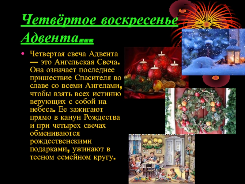 последнее пришествие Спасителя во славе со всеми Ангелами, чтобы взять всех истинно верующих с собой на небеса. Ее зажигают прямо в канун Рождества и при четырех свечах обмениваются рождественскими подарками, ужинают в тесном семейном кругу.