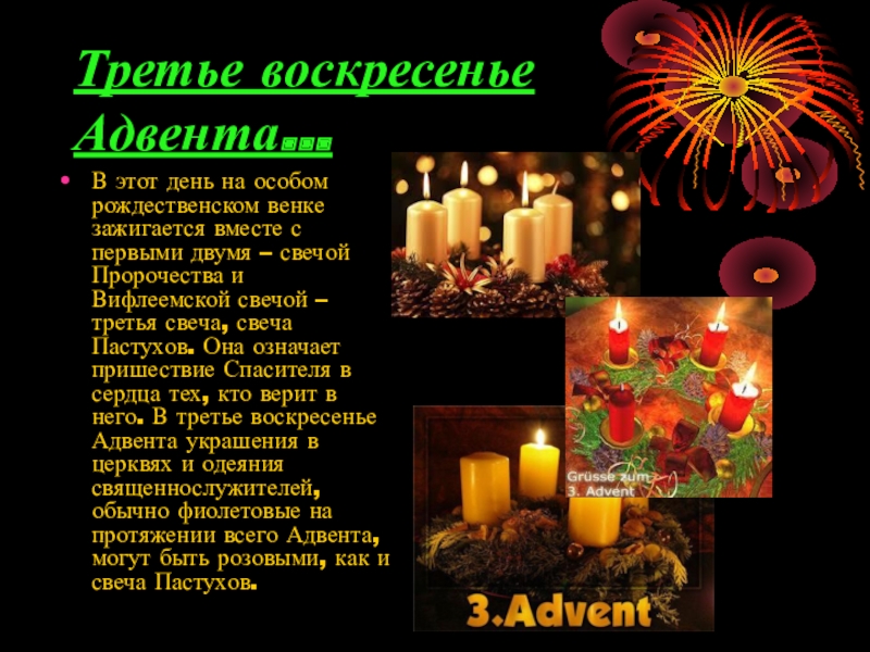 первыми двумя – свечой Пророчества и Вифлеемской свечой – третья свеча, свеча Пастухов. Она означает пришествие Спасителя в сердца тех, кто верит в него. В третье воскресенье Адвента украшения в церквях и одеяния священнослужителей, обычно фиолетовые на протяжении всего Адвента, могут быть розовыми, как и свеча Пастухов.