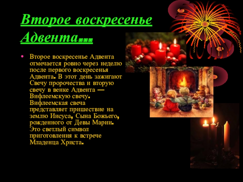 воскресенья Адвента. В этот день зажигают Свечу пророчества и вторую свечу в венке Адвента — Вифлеемскую свечу. Вифлеемская свеча представляет пришествие на землю Иисуса, Сына Божьего, рожденного от Девы Марии. Это светлый символ приготовления к встрече Младенца Христа.