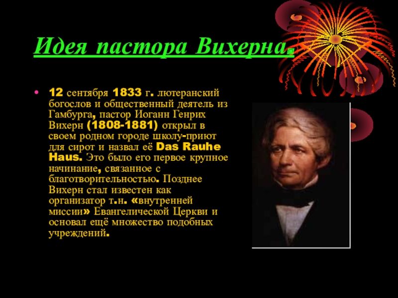 из Гамбурга, пастор Иоганн Генрих Вихерн (1808-1881) открыл в своем родном городе школу-приют для сирот и назвал её Das Rauhe Haus. Это было его первое крупное начинание, связанное с благотворительностью. Позднее Вихерн стал известен как организатор т.н. «внутренней миссии» Евангелической Церкви и основал ещё множество подобных учреждений.