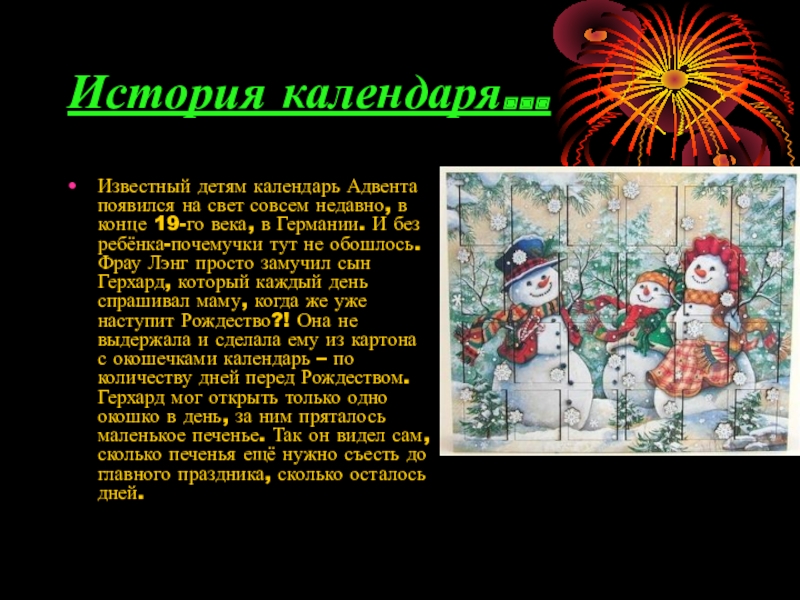 конце 19-го века, в Германии. И без ребёнка-почемучки тут не обошлось. Фрау Лэнг просто замучил сын Герхард, который каждый день спрашивал маму, когда же уже наступит Рождество?! Она не выдержала и сделала ему из картона с окошечками календарь – по количеству дней перед Рождеством. Герхард мог открыть только одно окошко в день, за ним пряталось маленькое печенье. Так он видел сам, сколько печенья ещё нужно съесть до главного праздника, сколько осталось дней.