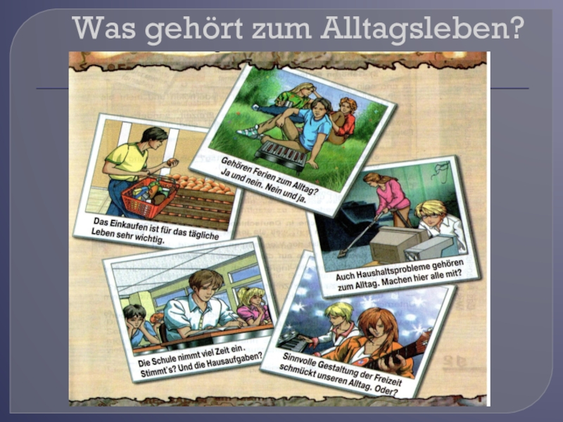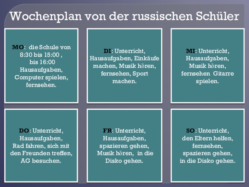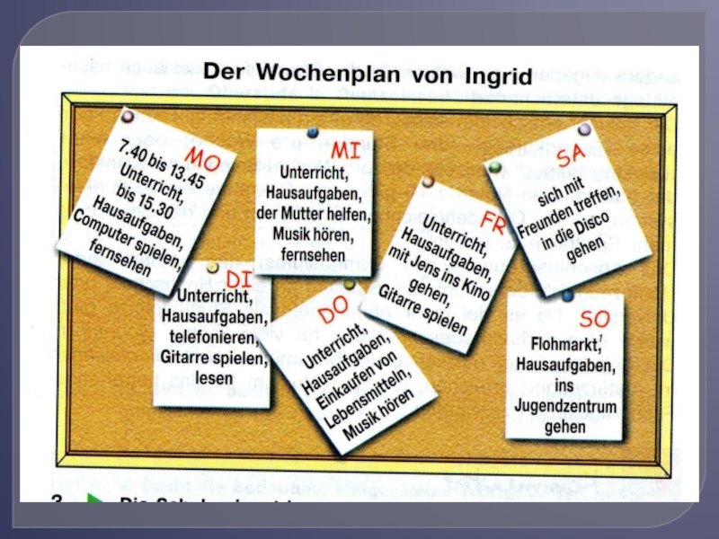 DI: Unterricht, Hausaufgaben, Einkäufe machen, Musik hȍren,