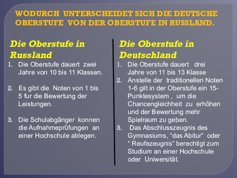 Das Abschlusszeugnis des Gymnasiums, “das Abitur” oder “ Reufezeugnis” berechtigt zum Studium an einer Hochschule oder Uniwersitȁt.