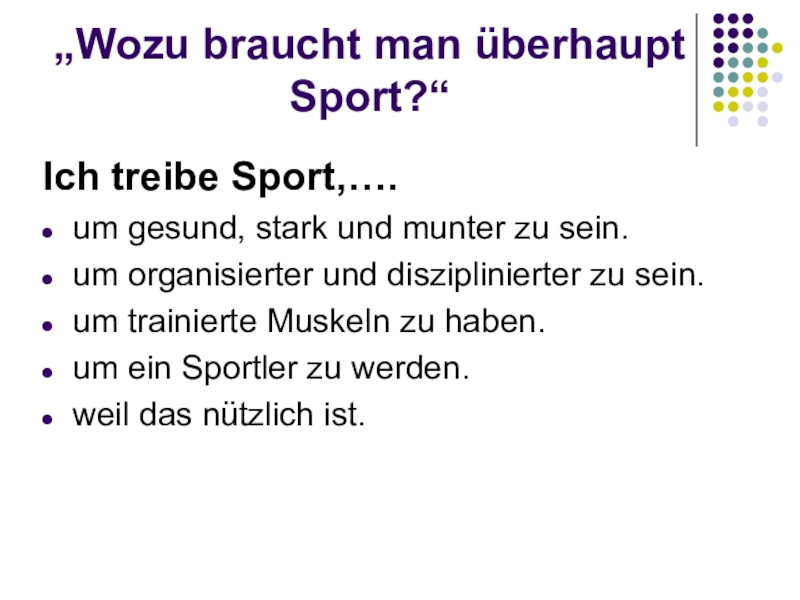 „Wozu braucht man überhaupt Sport?“Ich treibe Sport,….um gesund, stark und munter zu sein.um organisierter und disziplinierter zu