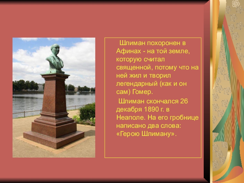 1868 Шлиманн занимался историей Греции, уделяя особое внимание поэмам Гомера.