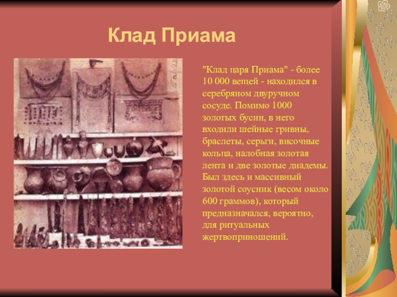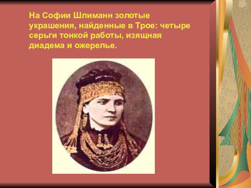 На Софии Шлиманн золотые украшения, найденные в Трое: четыре серьги тонкой работы, изящная диадема и ожерелье.