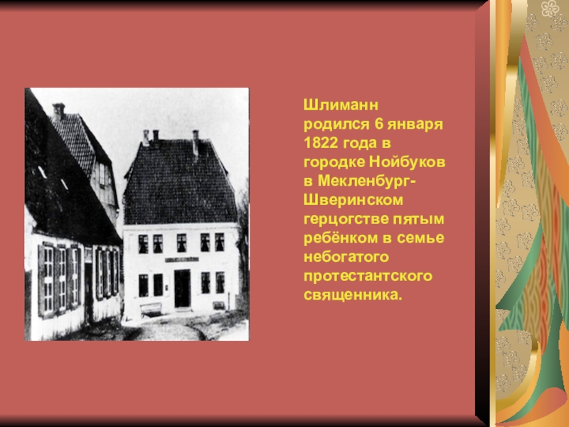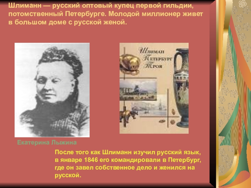 После того как Шлиманн изучил русский язык, в январе 1846 его командировали в Петербург, где он завел собственное дело и женился на русской.