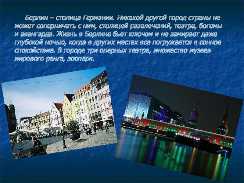 не может соперничать с ним, столицей развлечений, театра, богемы и авангарда. Жизнь в Берлине бьет ключом и не замирает даже глубокой ночью, когда в других местах все погружается в сонное спокойствие. В городе три оперных театра, множество музеев мирового ранга, зоопарк.