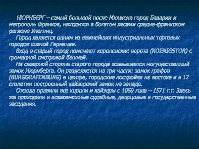и метрополь Франков, находится в богатом лесами средне-франкском регионе Упегниц. Город является одним из важнейших индустриальных торговых городов южной Германии. Вход в старый город помечают королевские ворота (КOENIGSTOR) с громадной смотровой башней. На северной стороне старого города возвышается могущественный замок Нюрнберга. Он разделяется на три части: замок графов (BURGGRAFENBURG) в центре, городские постройки на востоке и в 12 столетии построенный кайзерский замок на западе. Отсюда правили все короли и кайзеры с 1050 года – 1571 г.г. Здесь же проходили и всевозможные судебные, дворцовые и государственные заседания.
