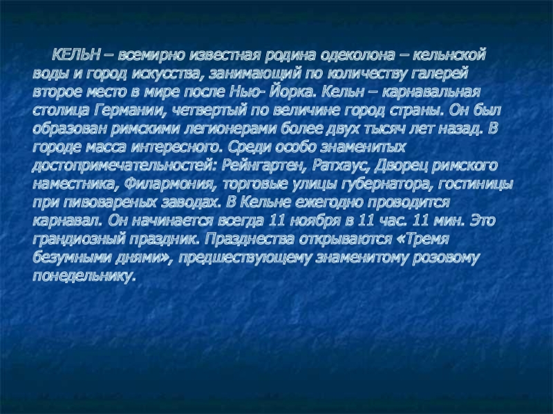 и город искусства, занимающий по количеству галерей второе место в мире после Нью- Йорка. Кельн – карнавальная столица Германии, четвертый по величине город страны. Он был образован римскими легионерами более двух тысяч лет назад. В городе масса интересного. Среди особо знаменитых достопримечательностей: Рейнгартен, Ратхаус, Дворец римского наместника, Филармония, торговые улицы губернатора, гостиницы при пивовареных заводах. В Кельне ежегодно проводится карнавал. Он начинается всегда 11 ноября в 11 час. 11 мин. Это грандиозный праздник. Празднества открываются «Тремя безумными днями», предшествующему знаменитому розовому понедельнику.