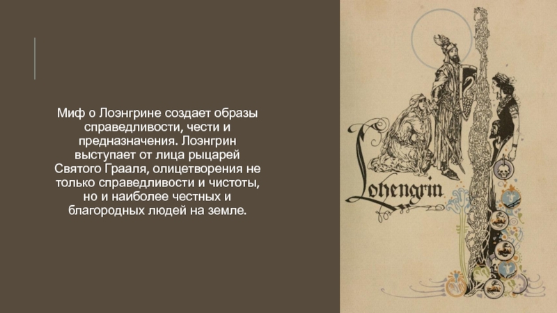 Миф о Лоэнгрине создает образы справедливости, чести и предназначения. Лоэнгрин