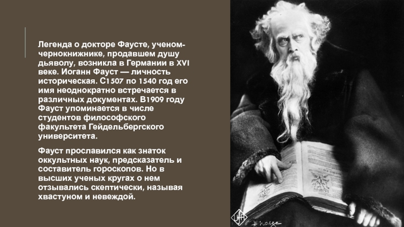 в Германии в XVI веке. Иоганн Фауст — личность историческая. С1507 по 1540 год его имя неоднократно встречается в различных документах. В1909 году Фауст упоминается в числе студентов философского факультета Гейдельбергского университета.
