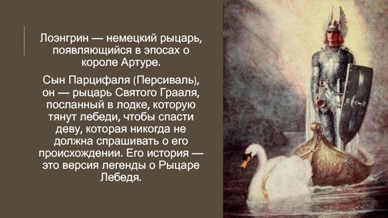 Лоэнгрин — немецкий рыцарь, появляющийся в эпосах о короле Артуре.Сын Парцифаля (Персиваль), он — рыцарь