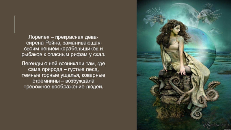 Лорелея – прекрасная дева-сирена Рейна, заманивающая своим пением корабельщиков и рыбаков к опасным рифам у скал.Легенды