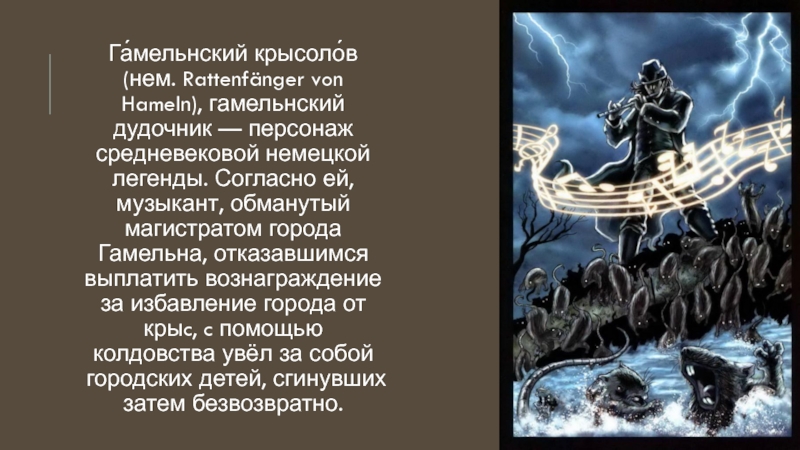 средневековой немецкой легенды. Согласно ей, музыкант, обманутый магистратом города Гамельна, отказавшимся выплатить вознаграждение за избавление города от крыc, c помощью колдовства увёл за собой городских детей, сгинувших затем безвозвратно.