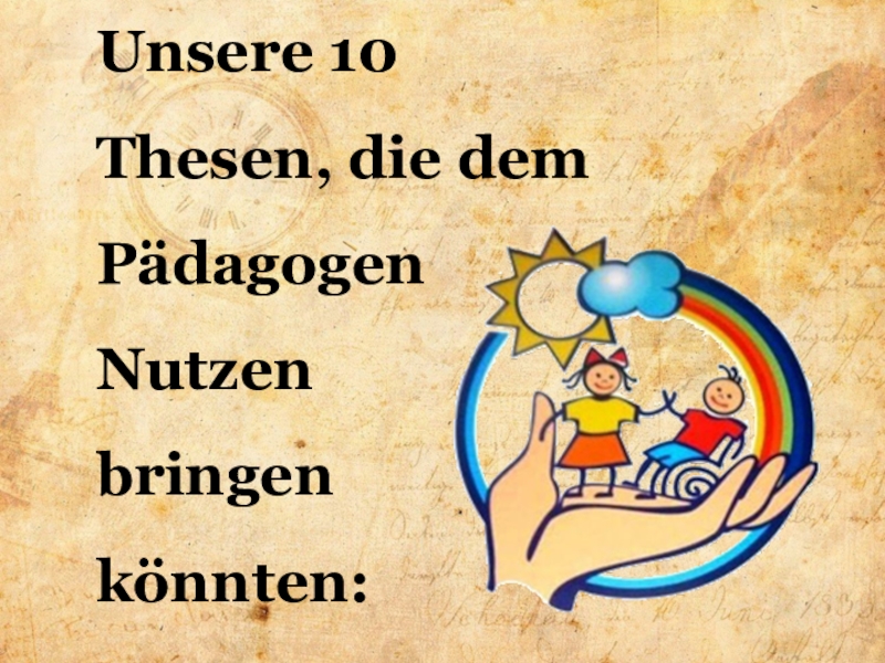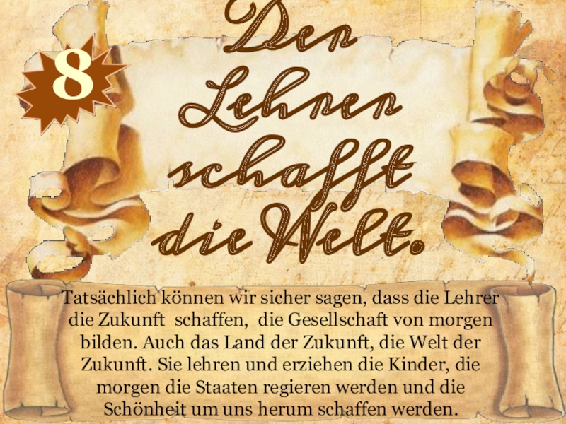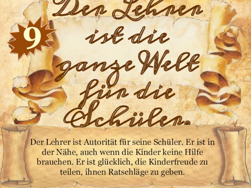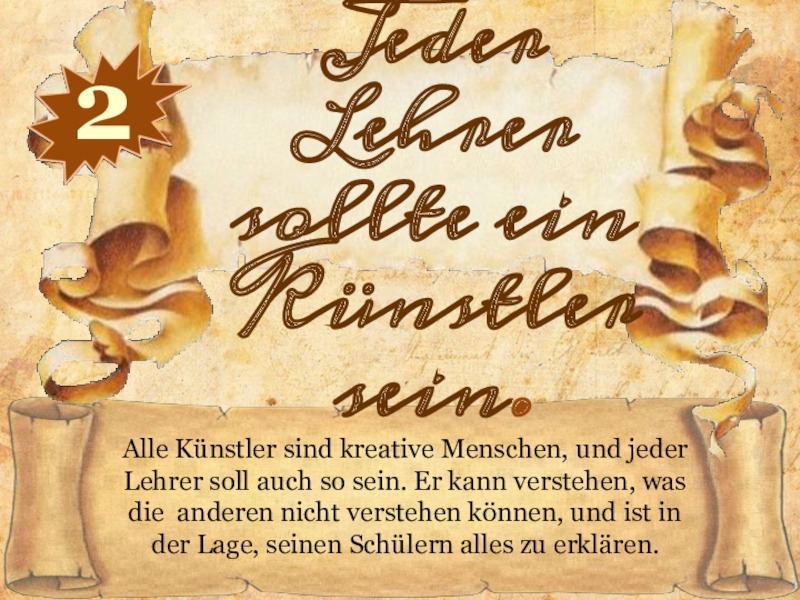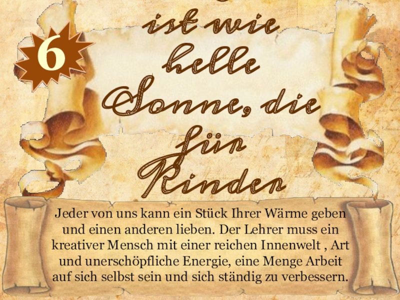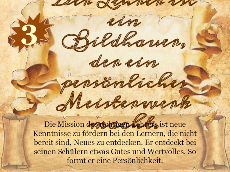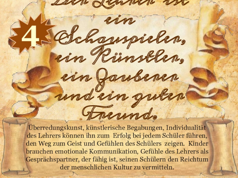 Überredungskunst, künstlerische Begabungen, Individualität des Lehrers können ihn zum Erfolg bei jedem Schüler führen, den Weg zum Geist und Gefühlen des Schülers zeigen. Kinder brauchen emotionale Kommunikation, Gefühle des Lehrers als Gesprächspartner, der fähig ist, seinen Schülern den Reichtum der menschlichen Kultur zu vermitteln.
