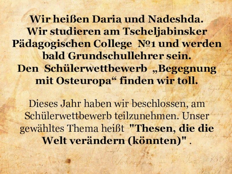 Dieses Jahr haben wir beschlossen, am Schülerwettbewerb teilzunehmen. Unser gewähltes Thema heißt "Thesen, die die Welt verändern (könnten)" .