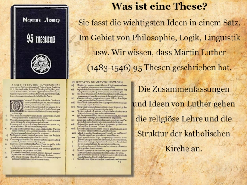 Die Zusammenfassungen und Ideen von Luther gehen die religiöse Lehre und die Struktur der katholischen Kirche an.