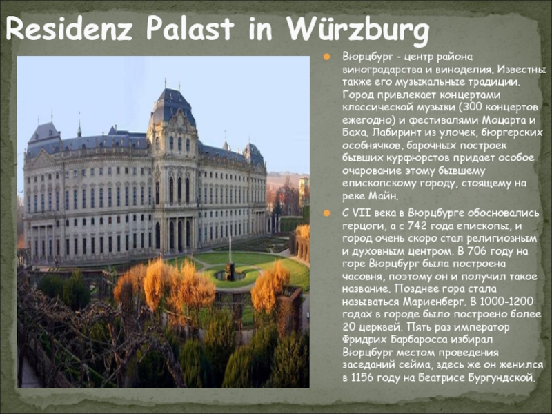 С VII века в Вюрцбурге обосновались герцоги, а с 742 года епископы, и город очень скоро стал религиозным и духовным центром. В 706 году на горе Вюрцбург была построена часовня, поэтому он и получил такое название. Позднее гора стала называться Мариенберг. В 1000-1200 годах в городе было построено более 20 церквей. Пять раз император Фридрих Барбаросса избирал Вюрцбург местом проведения заседаний сейма, здесь же он женился в 1156 году на Беатрисе Бургундской.