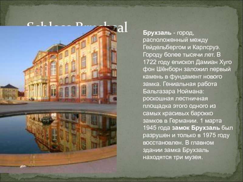 тысячи лет. В 1722 году епископ Дамиан Хуго фон Шёнборн заложил первый камень в фундамент нового замка. Гениальная работа Бальтазара Ноймана: роскошная лестничная площадка этого одного из самых красивых барокко замков в Германии. 1 марта 1945 года замок Брухзаль был разрушен и только в 1975 году восстановлен. В главном здании замка Брухзаль находятся три музея.