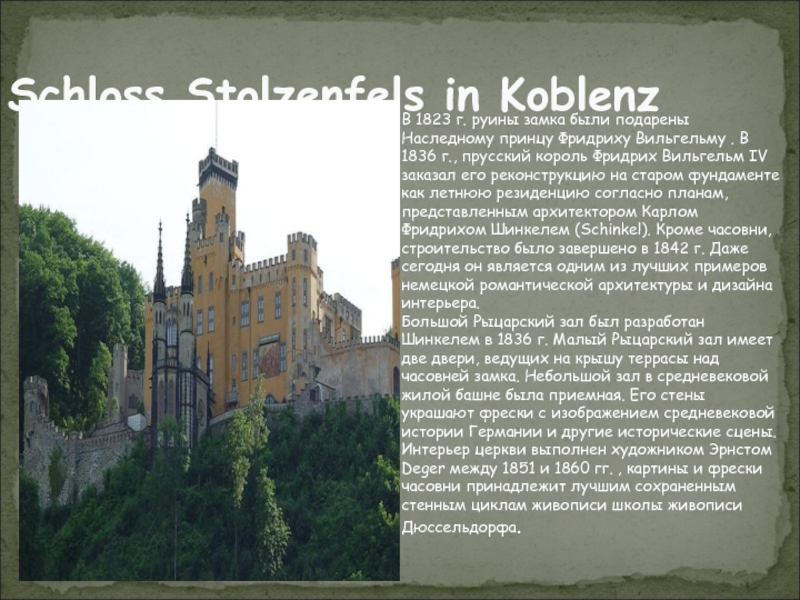Наследному принцу Фридриху Вильгельму . В 1836 г., прусский король Фридрих Вильгельм IV заказал его реконструкцию на старом фундаменте как летнюю резиденцию согласно планам, представленным архитектором Карлом Фридрихом Шинкелем (Schinkel). Кроме часовни, строительство было завершено в 1842 г. Даже сегодня он является одним из лучших примеров немецкой романтической архитектуры и дизайна интерьера.