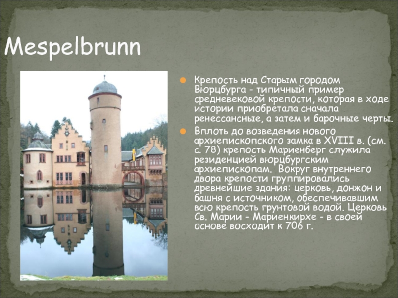 Вплоть до возведения нового архиепископского замка в XVIII в. (см. с. 78) крепость Мариенберг служила резиденцией вюрцбургским архиепископам. Вокруг внутреннего двора крепости группировались древнейшие здания: церковь, донжон и башня с источником, обеспечивавшим всю крепость грунтовой водой. Церковь Св. Марии - Мариенкирхе - в своей основе восходит к 706 г.