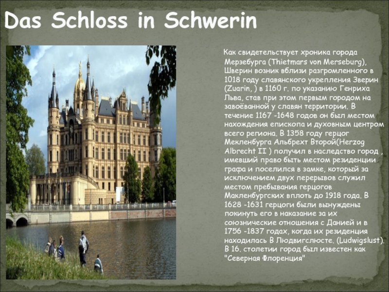 Мерзебурга (Thietmars von Merseburg), Шверин возник вблизи разгромленного в 1018 году славянского укрепления Зверин (Zuarin, ) в 1160 г. по указанию Генриха Льва, став при этом первым городом на завоёванной у славян территории. В течение 1167 -1648 годов он был местом нахождения епископа и духовным центром всего региона. В 1358 году герцог Мекленбурга Альбрехт Второй(Herzog Albrecht II ) получил в наследство город , имевший право быть местом резиденции графа и поселился в замке, который за исключением двух перерывов служил местом пребывания герцогов Макленбургских вплоть до 1918 года. В 1628 -1631 герцоги были вынуждены покинуть его в наказание за их союзнические отношения с Данией и в 1756 -1837 годах, когда их резиденция находилась В Людвигслюсте. (Ludwigslust). В 16. столетии город был известен как "Северная Флоренция"
