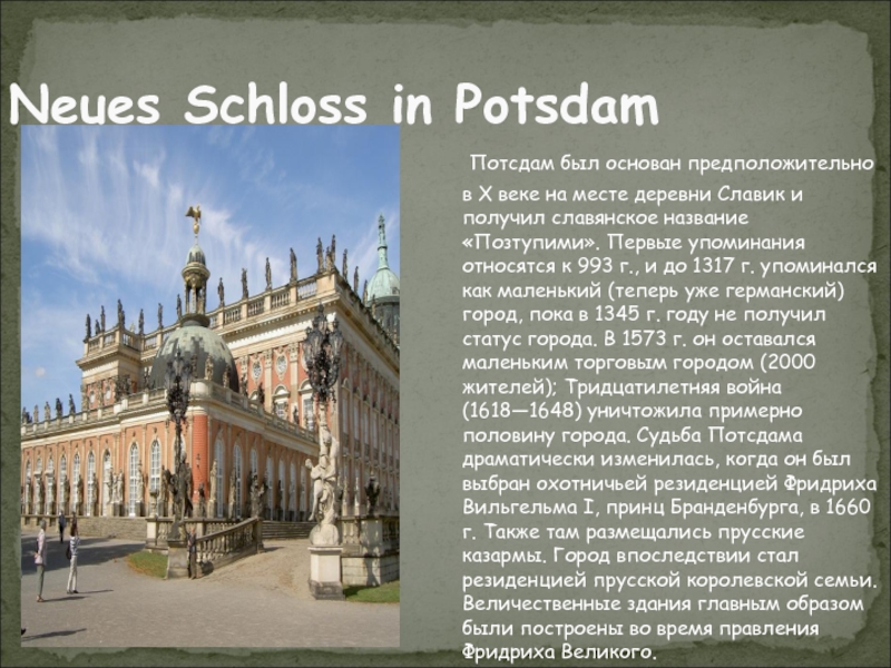 X веке на месте деревни Славик и получил славянское название «Позтупими». Первые упоминания относятся к 993 г., и до 1317 г. упоминался как маленький (теперь уже германский) город, пока в 1345 г. году не получил статус города. В 1573 г. он оставался маленьким торговым городом (2000 жителей); Тридцатилетняя война (1618—1648) уничтожила примерно половину города. Судьба Потсдама драматически изменилась, когда он был выбран охотничьей резиденцией Фридриха Вильгельма I, принц Бранденбурга, в 1660 г. Также там размещались прусские казармы. Город впоследствии стал резиденцией прусской королевской семьи. Величественные здания главным образом были построены во время правления Фридриха Великого.