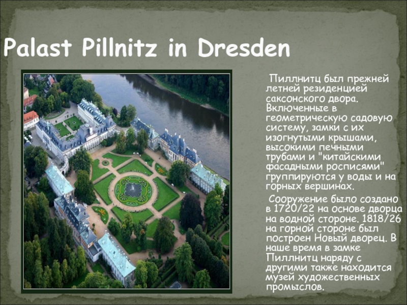 резиденцией саксонского двора. Включенные в геометрическую садовую систему, замки с их изогнутыми крышами, высокими печными трубами и "китайскими фасадными росписями" группируются у воды и на горных вершинах.
