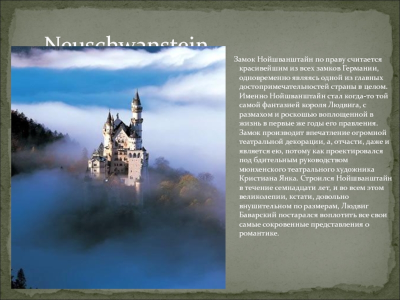 замков Германии, одновременно являясь одной из главных достопримечательностей страны в целом. Именно Нойшванштайн стал когда-то той самой фантазией короля Людвига, с размахом и роскошью воплощенной в жизнь в первые же годы его правления. Замок производит впечатление огромной театральной декорации, а, отчасти, даже и является ею, потому как проектировался под бдительным руководством мюнхенского театрального художника Кристиана Янка. Строился Нойшванштайн в течение семнадцати лет, и во всем этом великолепии, кстати, довольно внушительном по размерам, Людвиг Баварский постарался воплотить все свои самые сокровенные представления о романтике.