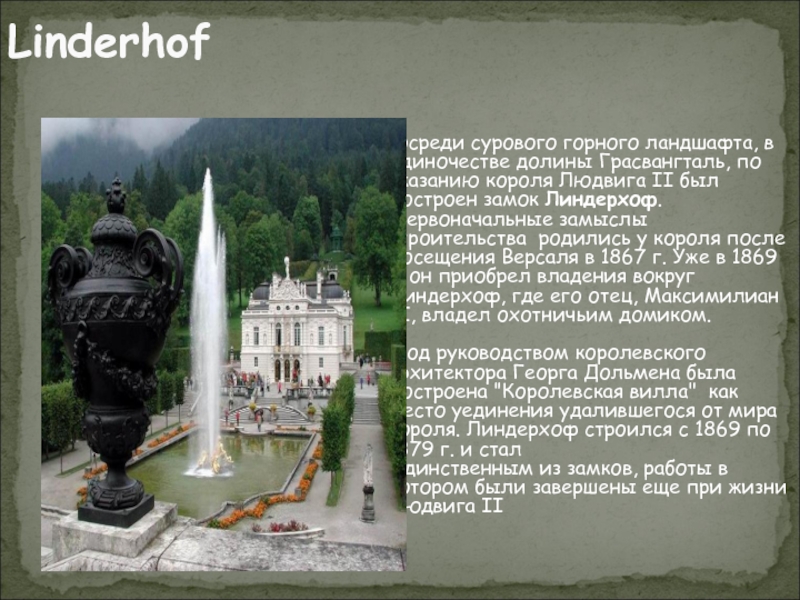 указанию короля Людвига II был построен замок Линдерхоф. Первоначальные замыслы строительства родились у короля после посещения Версаля в 1867 г. Уже в 1869 г. он приобрел владения вокруг Линдерхоф, где его отец, Максимилиан II, владел охотничьим домиком.