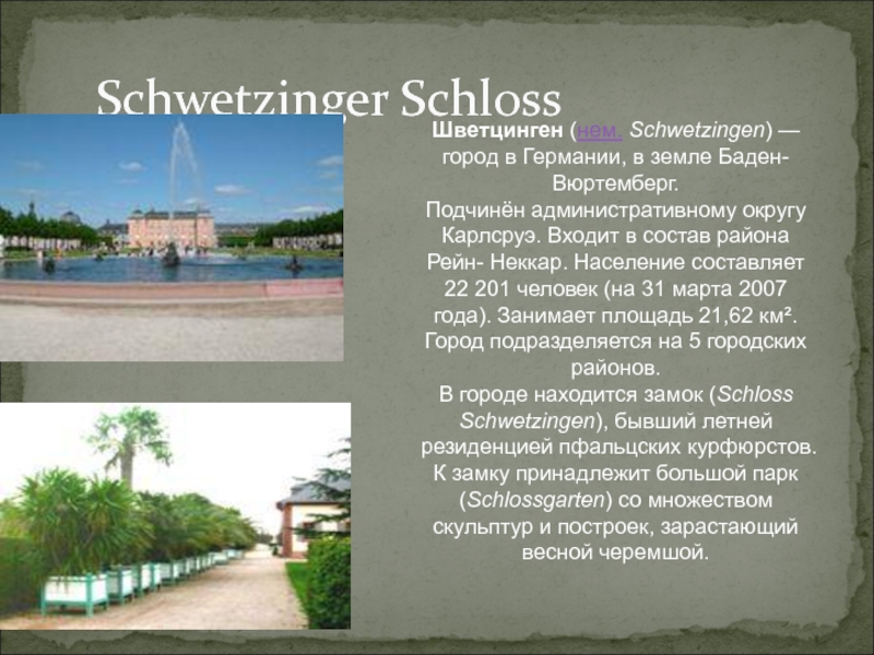 Шветцинген (нем. Schwetzingen) — город в Германии, в земле
