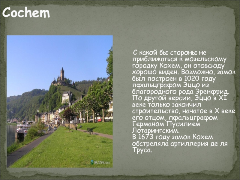 мозельскому городку Кохем, он отовсюду хорошо виден. Возможно, замок был построен в 1020 году пфальцграфом Эццо из благородного рода Эренфрид. По другой версии, Эццо в XI веке только закончил строительство, начатое в X веке его отцом, пфальцграфом Германом Пусилием Лотарингским.