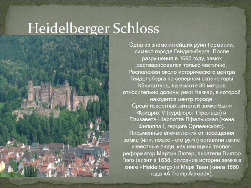 Одна из знаменитейших руин Германии, символ города Гейдельберга. После