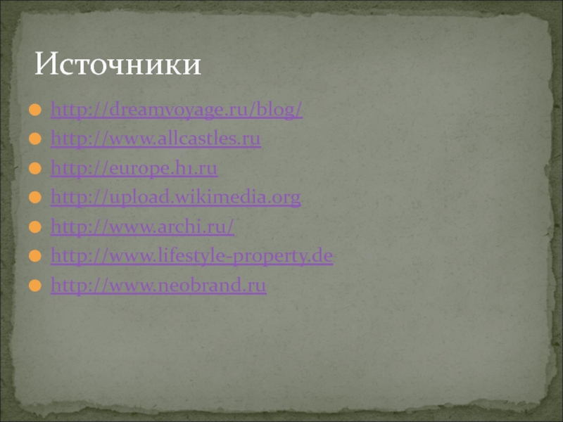 Besondere Aufmerksamkeit schenken uns die Schlosser dieses Landes. Als ich die Geschichte der Einrichtung von Schlossern erkannte, beschloss ich eine Präsentation über die deutsche Schlosser und über die Besonderheiten der Arhitektur zusammemzustellen. Solcher Weise möchte ich meine Kenntnisse und Erhfahrung mit anderen teilen. Jeder Schloss ist gratios und herrlich und diese Pracht wiederspiegelte ich in vorhandenen Fotos und Unterschriften.
