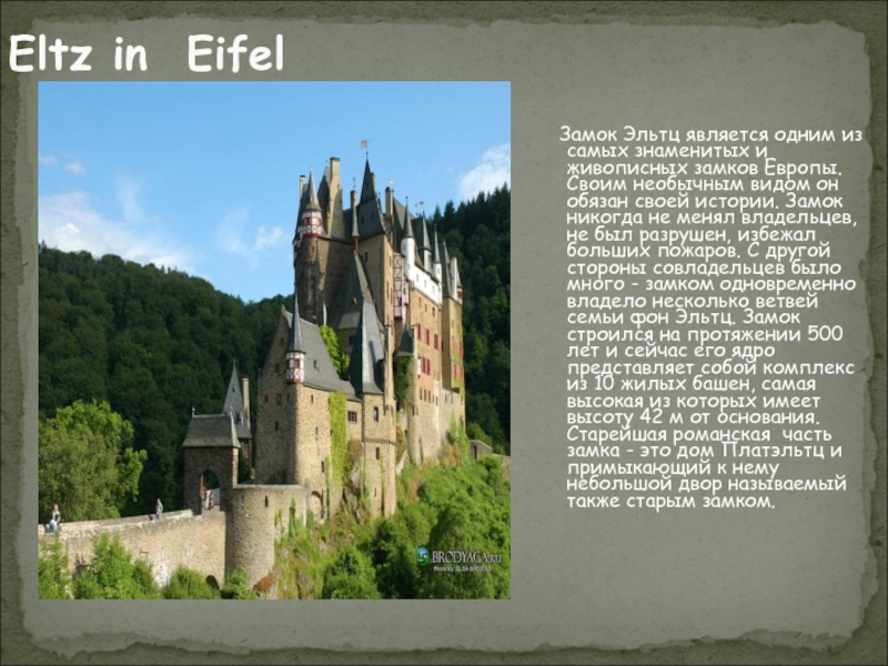 знаменитых и живописных замков Европы. Своим необычным видом он обязан своей истории. Замок никогда не менял владельцев, не был разрушен, избежал больших пожаров. С другой стороны совладельцев было много - замком одновременно владело несколько ветвей семьи фон Эльтц. Замок строился на протяжении 500 лет и сейчас его ядро представляет собой комплекс из 10 жилых башен, самая высокая из которых имеет высоту 42 м от основания. Старейшая романская часть замка - это дом Платэльтц и примыкающий к нему небольшой двор называемый также старым замком.