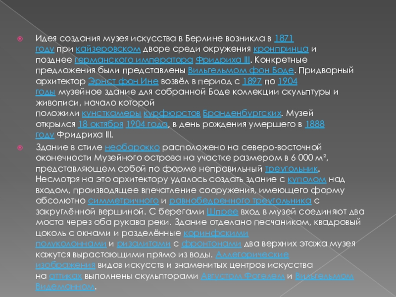 Слайд 2Идея создания музея искусства в Берлине возникла в 1871 году при кайзеровском дворе среди окружения кронпринца и