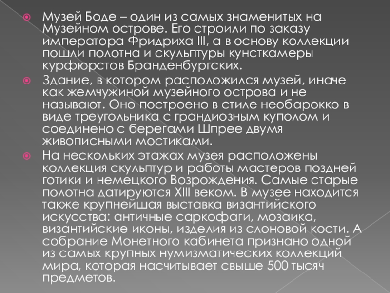 Слайд 17Музей Боде – один из самых знаменитых на Музейном острове. Его