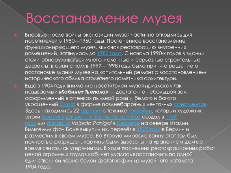 Восстановление музеяВпервые после войны экспозиции музея частично открылись для посетителей в 1950—1960 годы. Постепенное восстановление функционирующего музея, включая