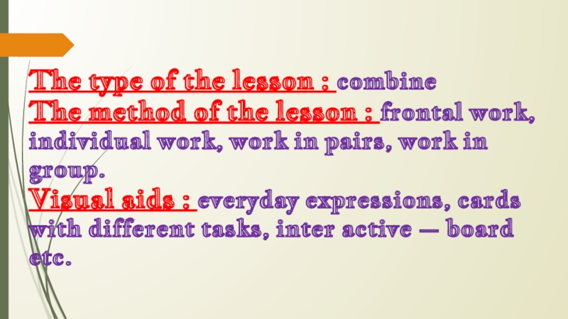 Visual aids : everyday expressions, cards with different tasks, inter active – board etc.