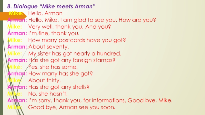8. Role play. Dialogue “ Mike meets Arman” (Work in pairs) 7 min 7 balls