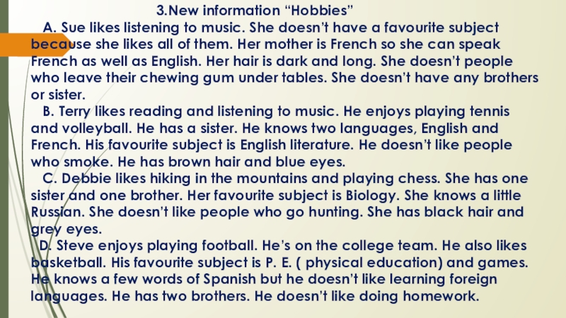A. Sue likes listening to music. She doesn’t have a favourite subject because she likes all of them. Her mother is French so she can speak French as well as English. Her hair is dark and long. She doesn’t people who leave their chewing gum under tables. She doesn’t have any brothers or sister.