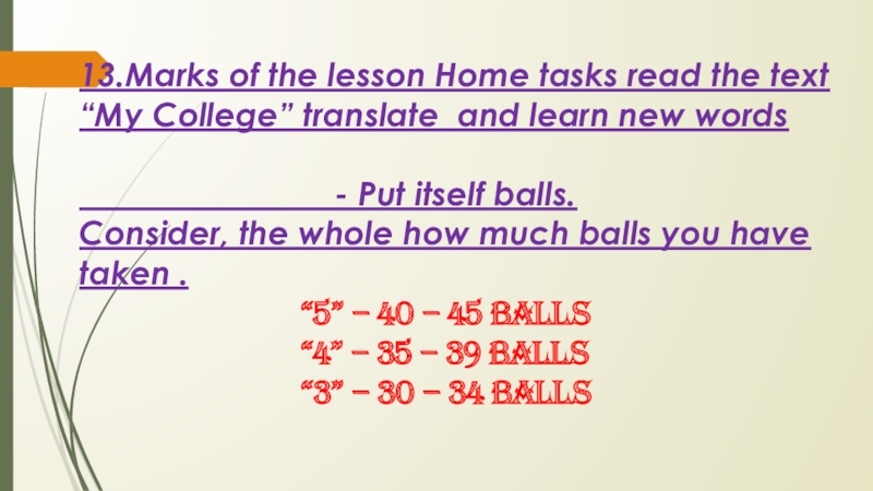 Слайд 2113.Marks of the lesson Home tasks read the text