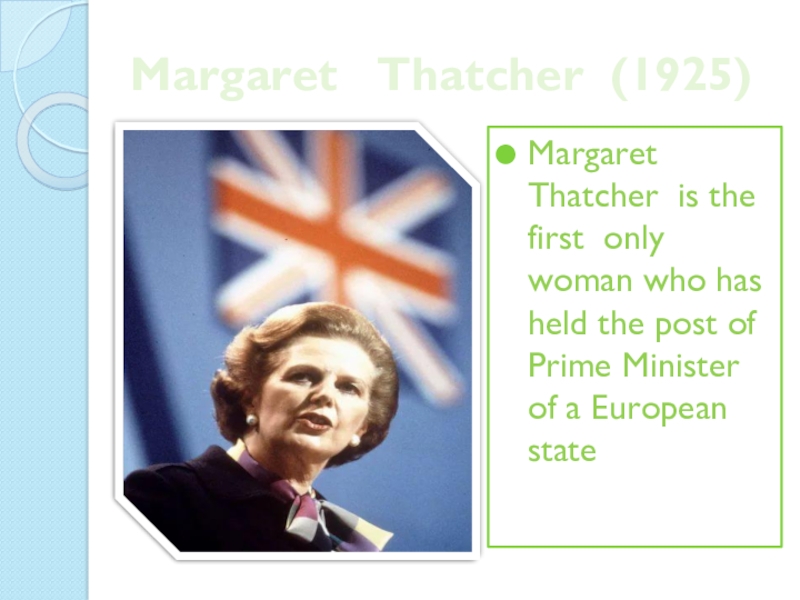 Margaret  Thatcher (1925)Margaret Thatcher is the first only woman who has held the post of Prime