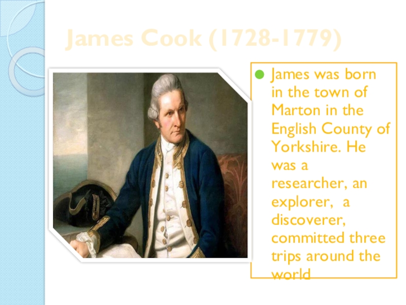 James Cook (1728-1779)James was born in the town of Marton in the English County of Yorkshire. He