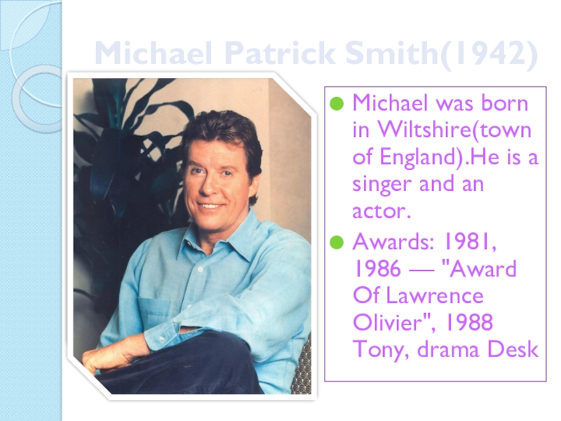 Michael Patrick Smith(1942)Michael was born in Wiltshire(town of England).He is a singer and an actor. Awards: 1981,
