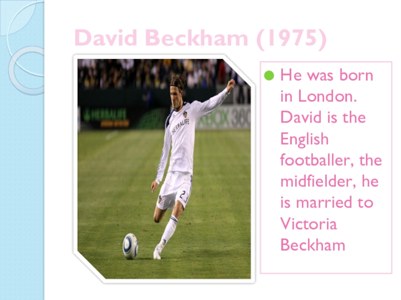 David Beckham (1975)He was born in London. David is the English footballer, the midfielder, he is married to Victoria Beckham
