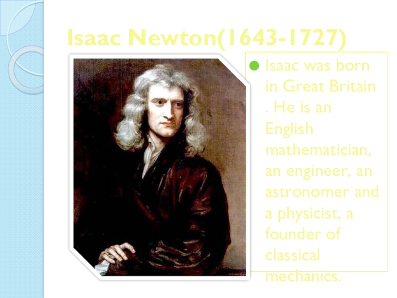 Isaac Newton(1643-1727)Isaac was born in Great Britain . He is an English mathematician, an engineer, an astronomer